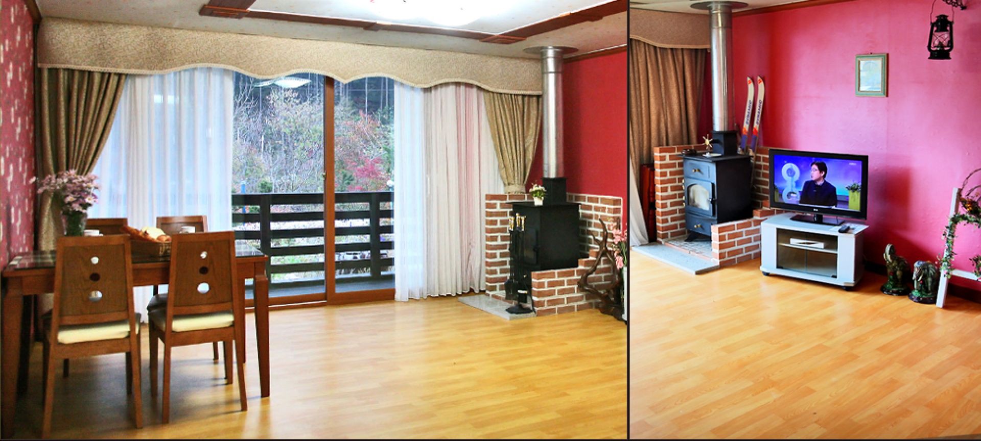 • 시설 : TV, 주방,냉장고,에어컨,전기밥솥,핫플레이트,주방집기,침대,화장실,샤워시설,욕실용품,화장대,커피포트,벽난로